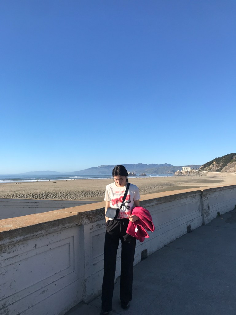 The pink cardigan is very cute. The color is so unique and vivid. It’s collarless cardigan made out of 100% virgin wool. It’s a perfect item for these kinds of days where there is a huge gap between day and night temperature.