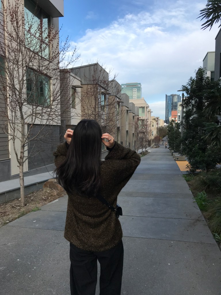 The sweater is very soft and well stretches. The silhouette is also unique that it’s a semi turtle neck. The sleeves are pretty long.